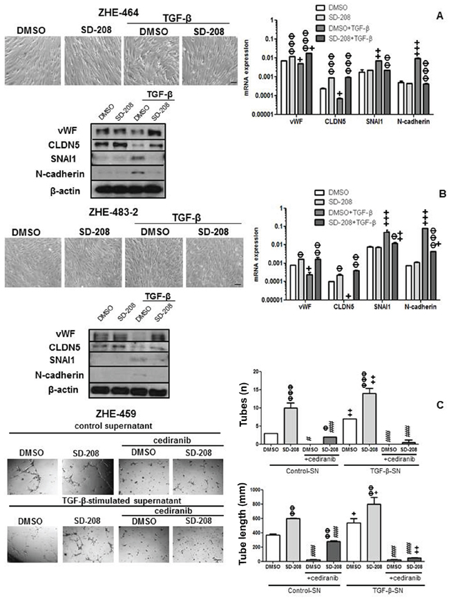 Figure 7: TGF-β induces EndMT and TGF-β-stimulated supernatant increases tube formation in GMEC. A, B. ZHE-464 (A) or ZHE-483–2 (B) were seeded in full medium and treated with TGF-β (10 ng/ml) or SD-208 (1 μM) for 96 h. Phase contrast images are shown. mRNA expression and protein levels of vWF, CLDN5, SNAI1 and N-cadherin were assessed by qRT-PCR at 72 h and immunoblot at 96 h respectively under the same conditions. Data are expressed as mean and SD (n = 3) (Φ p < 0.05, ΦΦ p < 0.01, ΦΦΦ p < 0.001, one way ANOVA followed by Tukey’s post hoc test, effect of SD-208, +p < 0.05, ++p < 0.01, +++p < 0.001, effect of TGF-β). C. ZHE-459 supernatant treated with TGF-β for 96 h was concentrated and added with or without cediranib (1 μM) to ZHE-459 pretreated with DMSO or 1 μM SD-208 for 1 h. Tube formation was assessed after 12 h, by calculating the number of tubes and tube length. Data are expressed as mean and SD (n = 3) (ΦΦ p < 0.01, ΦΦΦ p < 0.001, one-way ANOVA followed by Tukey’s post hoc test, effect of SD-208, +p < 0.05, ++p < 0.01, effect of TGF-β-stimulated supernatant, #p < 0.05, ##p < 0.01, ###p < 0.001, effect of cediranib).