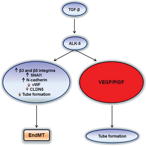 Figure 8: Two pathways of TGF-β/ALK-5 signalling in hCMEC and GMEC. TGF-β can increase VEGF/PlGF secretion via the ALK-5 pathway and create a pro-angiogenic milieu for the tumor or induce EndMT by decreasing endothelial properties and increasing the mesenchymal signatures for the tumor to become potentially more invasive.