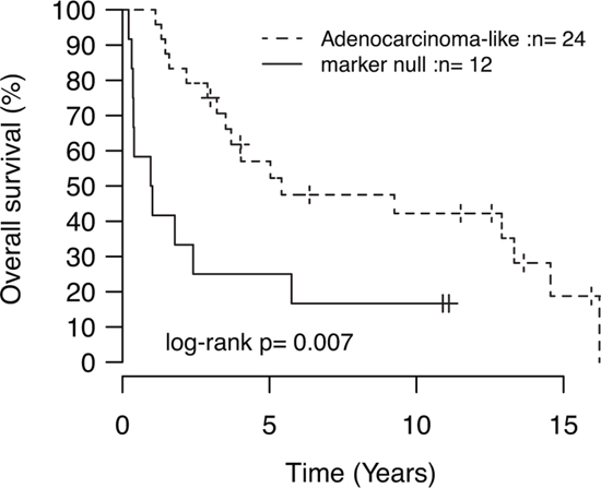 Recently, patient outcome and specific oncogene mutations in LC tumors have been associated with tumor subgroups defined by positive expression of adenocarcinoma (TTF-1/Napsin A) or squamous cell carcinoma (CK5/P40) immunohistochemistry markers [5]. In our LC cohort, 24 tumors (59%) were positive by immunohistochemistry for TTF-1/Napsin A (referred to as adenocarcinoma-like), 5 tumors (12%) were CK5/P40 positive (squamous-like), whereas 12 tumors (29%) did not express any of these IHC markers (marker null cases). Stratification of identified mutations by IHC subgroup revealed a striking enrichment of oncogene mutations in adenocarcinoma-like LC tumors (85% of all oncogene mutations, affecting 63% of these cases), including all nine KRAS mutations and the single NRAS (G12D) and MAP2K1/MEK1 (K57N) mutations (Figure 1A, Supplementary Tables S2 and S3). These KRAS mutations were all typical driver mutations located in codon 12 (one G12S, two G12C, three G12V mutations), 13 (one G13C and one G13D mutation), and 61 (one Q61K mutation), suggesting that these represent likely driver events in the affected tumors. In contrast, 92% of marker null cases carried a TP53 mutation, but only 17% of cases had an oncogene mutation (one BRAF Q456K and one MET T1010I mutation). Moreover, marker null cases showed a poorer overall survival compared to adenocarcinoma-like cases (p = 0.007, log-rank test, Figure 2). The poorer outcome of marker null LC cases compared to adenocarcinoma-like cases was significant also in multivariate analysis including immunomarker stratification, tumor stage, and gender as covariates and overall survival as clinical endpoint (Hazard ratio = 4.4, 95% Confidence interval = 1.5–12.5, p = 0.006 for marker null stratification).