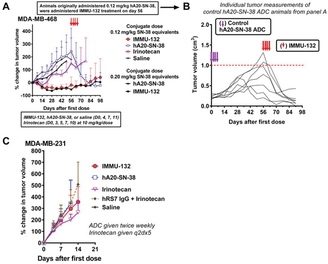 NCr female athymic nude (nu/nu) mice, 4–8 weeks old, were purchased from Taconic Farms (Germantown, NY). Capan-1 xenografts were established by making a tumor suspension from stock tumors and mixing with cells harvested from tissue culture. A 0.3mL injection, containing 20% w/v tumor suspension plus 1 × 107 cells, was injected subcutaneously into the flank. NCI-N87 and MDA-MB-468 tumors were established by harvesting cells from tissue culture and making a final cell suspension by mixing 1:1 with matrigel (BD Bioscience; San Jose, CA) such that each mouse received a total of 1 × 107 cells subcutaneously in the right flank. Tumor volume (TV) was determined by measurements in two dimensions using calipers, with volumes defined as: L × w2/2, where L is the longest dimension of the tumor and w the shortest. Mice were randomized into treatment groups and therapy begun when tumor volumes were approximately 0.25 cm3. Treatment regimens, dosages, and number of animals in each experiment are described in the Results and in the Figure Legends. The lyophilized IMMU-132 and control ADC (hA20-CL2A-SN-38) were reconstituted and diluted as required in sterile saline. SN-38 equivalents in a dose of 250 μg ADC to a 20-gram mouse (12.5 mg/kg) is equal to 0.2 mg SN-38/kg. For irinotecan (irinotecan-HCl injection; AREVA Pharmaceuticals, Inc., Elizabethtown, KY), 10 mg irinotecan/kg converts to 5.8 mg SN-38/kg based on mass.