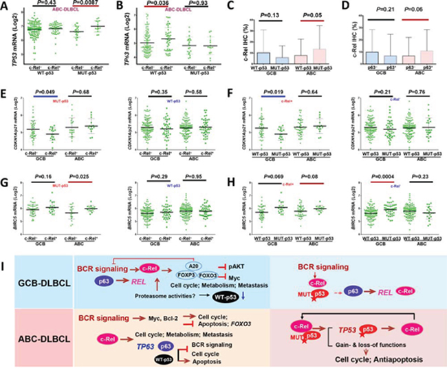 Our data suggested crosstalk exist between c-Rel and the p53 pathway, including MUT-TP53 induction at the transcriptional level in c-Rel+ ABC-DLBCL, the gain or loss of correlation with expression levels of genes involved in cell cycle (p21, AURKB), apoptosis (BIRC5, BCL2L11), TNF pathways (TRAF2, TANK), and tumor suppressor TP63. Concurrent c-Rel positivity and TP53 mutation correlated with significantly worse patient survival. This may excel result from formation of different c-Rel/NF-κB dimers, functional alterations, posttranslational modification [59], or increased REL mutations in patients with MUT-p53 [60]. In contrast, WT-p53 and p63 may excel tumor suppressor function towards c-Rel signaling by cell cycle arrest, proapoptosis and BCR signaling inhibition therefore abolished the prognostic effect of c-Rel activation.