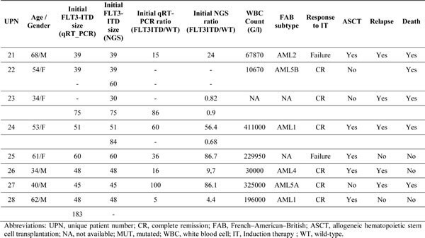 In parallel, initial screening for FLT3-ITD were carried out as previously reported [11]. The mutant FLT3/wild-type allelic ratio found at diagnosis was considered to be the baseline value of each patient. FLT3-ITD levels at different follow-up time-points were assessed by fragment analysis and expressed as the decimal log reduction in respect to the baseline value of each patient. NGS results were then reported and correlated for each patient.
