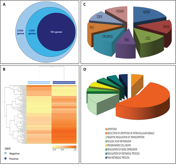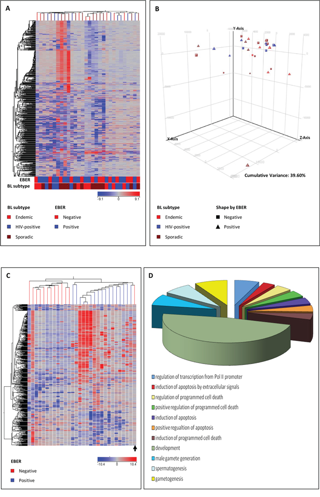 Figure 1: Unsupervised analyses (unsupervised hierarchical clustering, A. principal component analysis, B. failed to clearly discriminate Burkitt lymphoma (BL) subgroups based on the global gene profile. Supervised analysis (T-test) comparing EBV-positive and EBV-negative cases identified a series of differentially expressed genes C. In the matrix (A, C), the dendrogram was generated using a hierarchical clustering algorithm based on the average-linkage method. In the matrix, each column represents a sample and each row represents a gene. The color scale bar shows the relative gene expression changes normalized by the standard deviation (0 is the mean expression level of a given gene). The differentially expressed genes corresponded to significantly enriched biological functions according to Gene Ontology D.
