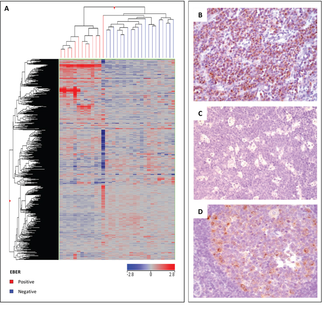 Figure 2: Validation of gene expression profiling. A. The molecular signature identified as distinctive of EBV-positive versus EBV-negative BL was applied to an independent set of cases, allowing a proper distinction of the two groups. In the matrix, each column represents a sample and each row represents a gene. The color scale bar shows the relative gene expression changes normalized by the standard deviation (0 is the mean expression level of a given gene). Immunohistochemical validation of mRNA results confirmed the differential expression of GCET, showing intense positivity in EBV-negative cases B. and negativity in EBV-positive cases C. which turned out to be strongly meaningful (p = 0.0008). As control for immunohistochemistry, a reactive germinal center was used D.