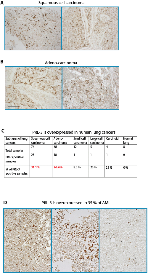 Figure 6: PRL-3 protein is upregulated in lung cancers and AML. A, B. Representative immunohistochemistry (IHC) staining of PRL-3 expression in lung squamous cell carcinoma (A) and lung adenocarcinoma (B). Scale bar: 100 µm. C. Summary of the percentages of PRL-3-positive lung cancers as detected with IHC, grouped according to cancer subtypes. D. In AML bone marrow samples were examined by IHC, 24 out of 69 (35%) showed PRL-3 expression. Three representative images are shown.