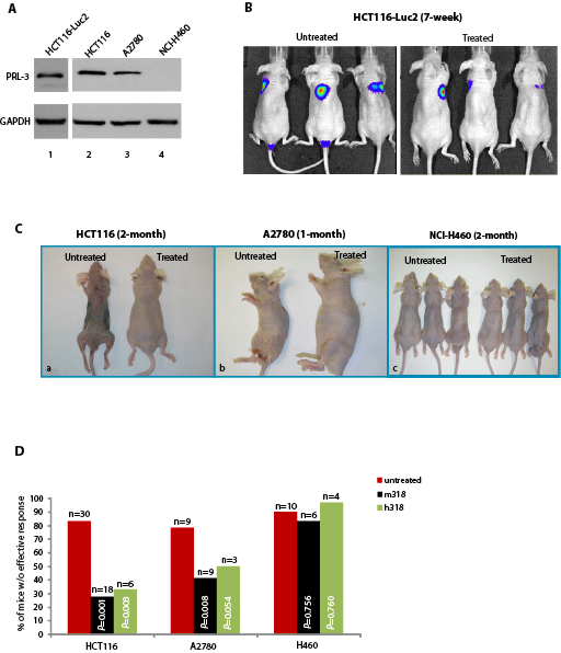 Figure 3: PRL-3 chimeric mAb inhibits the formation of metastatic tumors formed by A2780 cells and HCT-116 cells that express endogenous PRL-3. A. Total cell lysates were prepared from HCT116-luc2, HCT116, A2780, and NCI-H460 cancer cell lines. Endogenous PRL-3 protein was detected in HCT116-luc2, HCT116, and A2780 cells, but not in NCI-H460. B. On day 1, nude mice (n = 6) were injected with 1 x 106 HCT116-luc2 cancer cells and subsequently administered with PRL-3 chimeric mAb (treated, n = 3) or PBS (untreated, n = 3) on day 3, followed by biweekly intravenous administrations of the PRL-3 chimeric mAb or PBS, respectively, for 7-weeks. Both cancer cells and antibodies were injected via tail vein. IVIS Imaging System was used to track and monitor tumor development in vivo. C. On day 1, nude mice were injected with 1 x 106 cancer cells and treated as described in B. Paired experiments (untreated/treated) were terminated when mice appeared moribund. Experiment durations are indicated on the top of each panel. D. Summary of results from the 101 mice used in this study, comparing the therapeutic efficacies of mouse PRL-3 (m318) or chimeric PRL-3 (h318) in nude mice injected with three different human cancer cell lines. Fisher’s exact test was used to score the percentage of mice without effective treatment outcome. Red columns represent untreated mice, while black columns represent treated mice. p < 0.05 was regarded statistically significant. n = numbers of mice per group.
