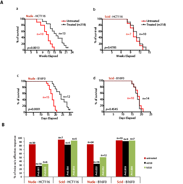 Figure 4: B-cells are important in mediating therapeutic efficacy of PRL-3 chimeric antibody. A. Kaplan-Meier survival curves of treated and untreated HCT-116-injected nude and scid mice (a, b). Kaplan-Meier survival curves of treated and untreated B16F0-injected nude and scid mice (c, d). B. Summary of results from the 151 mice used in this study, comparing the results for therapeutic experiments in nude and scid mice (a-d). Fisher’s exact test was used to score the percentage of mice without effective treatment indicated at Y-axis. Red columns represent untreated mice, while black or green columns represent mice treated with mouse mAb (m318) or chimeric mAb (h318), respectively. p < 0.05 was regarded statistically significant. n = numbers of mice per group.