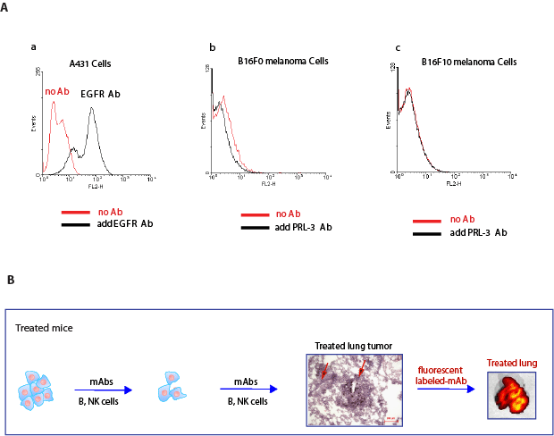 Figure 5: PRL-3 is not detectable at the cell surface, but accumulates promptly at sites of cancer metastasis in vivo. A. a. A peak-shift observed in A431 cells incubated with EGF-receptor antibody (black line) compared to A431 cells without incubation of EGF-receptor antibody (red line). b. No peak-shift was observed in B16F0 cells incubated with PRL-3 mAb (black line) and without Ab (red line). c. No peak-shift was observed in B16F10 cells incubated with PRL-3 mAb (black line) and without Ab (red line). B. Nude mice were injected with B16F0 cancer cells, ‘treated’ mice were followed by the therapeutic schedule in Fig. 2B. Labeled PRL-3 antibodies were intravenously injected 1 hr before IVIS live imaging at the end of experiment. A strongly fluorescent labeled lung was evident in ‘treated’ mice. We hypothesize that early delivery of the antibody will allow persistent attack of cancer cells to prevent them from further progression, resulting in micro-metastases in ‘open’ stages. As such, fluorescent labeled PRL-3 antibody can access and bind to metastatic lung tumors in such ‘treated’ mice. Scale bar: 200 µm. Red arrows indicate blood vessels.