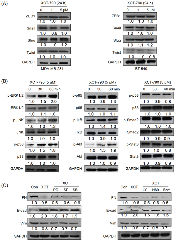 Figure 3: EMT related transcription factors and signal pathways including MAPK, PI3K/Akt, NF-κB do not mediate the suppression effects of XCT-790 on EMT. MDA-MB-231 A. and BT549 B. were treated with 1 or 5 μM XCT-790 for 24 h, then the protein levels of Snail, Slug, Twist, and ZEB were detected by Western blot analysis; (B) MDA-MB-231 cells were treated with 5 μM XCT-790 for the indicated times, the phosphorylation and total levels of signal pathways including MAPK, PI3K/Akt, NF-κB, p53, Smad, and Stat3 were measured by Western blot analysis; C. MDA-MB-231 cells were pretreated 10 μM MEK inhibitor PD98059(PD), JNK inhibitor SP600125 (SP), p38-MAPK inhibitor SB203580 (SB), PI3K inhibitor LY294002 (LY), PKA inhibitor H-89, or NF-κB inhibitor BAY11–7082 (BAY) for 90 min, and then exposed to 5 μM XCT-790 for further 24 h, the expression of FN, E-Cad, and Vim were measured by Western blot analysis. Data represent the average of three independent experiments.