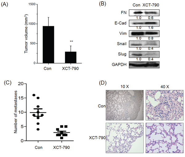 Figure 5: Targeted inhibition of ERRα inhibits the growth and metastasis of TNBC in vivo. A. The tumor volume of XCT-790 and control group at the end of experiment; B. The EMT related biomarkers and transcription factors were determined by Western blot analysis in the tumor lysates from the control and XCT-790 treated group; C. Numbers of lung metastases in the control and XCT-790 treated group at the end of experiment; D. H&E examination of metastasis in lung tissue sections of the control and XCT-790 group. **p < 0.01 compared with control.
