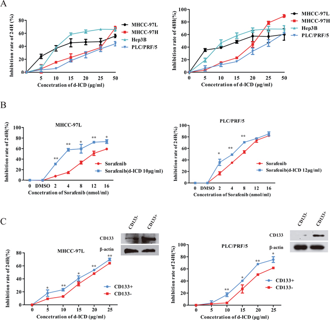 Figure 1: d-ICD inhibited HCC cells growth. A. Growth inhibition induced by the treatment of HCC cells with d-ICD for 24 h and 48 h. B. Growth inhibition induced by the treatment of MHCC-97L and PLC/PRF/5 cells with sorafenib combining with low dose of d-ICD for 24 h. (values were represented as the mean ± SD; *p < 0.05, **p < 0.01; t-test, vs cells treated with sorafenib only) C. Growth inhibition induced by the treatment of CD133+ and CD133− HCC cells with d-ICD for 24 h. (values were represented as the mean ± SD; *p < 0.05, **p < 0.01; Student t test, vs corresponding CD133− cells group).