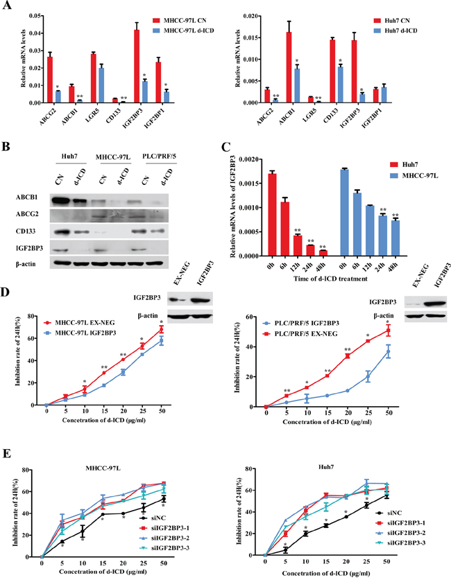 To further evaluate the molecular mechanism by which d-ICD inhibited cell growth in HCC, we applied cDNA microarrays to detect the differentially expressed genes in Huh7 and SMMC-7721 cells between the control and d-ICD treatment groups. The resulting genes were verified via RT-PCR assays, and we confirmed the deregulation of several genes in Huh7 cells due to d-ICD treatment (Supplementary Table S1). Among these candidate genes, we found that the drug resistance-related genes ABCB1 and ABCG2, as well as the stemness-related genes CD133, Lgr5, IGF2BP3 and IGF2BP1, were downregulated at the mRNA level, and CD133, IGF2BP3, ABCB1 and ABCG2 protein expression were also downregulated following d-ICD treatment (Figure 2A and 2B). Among these genes, IGF2BP3 mRNA expression gradually decreased after exposure to d-ICD in Huh7, MHCC-97L and PLC/PRF/5 cells in a time-dependent manner (Figure 2C, Supplementary Figure S1).