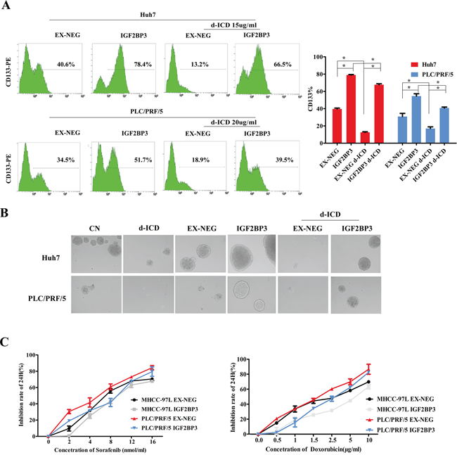 Figure 3: IGF2BP3 enriched CSCs population and promoted chemoresistence. A. The percentage of CD133+ cells was determined by flow cytometry. Statistically significant differences were determined using the Student t test (*p < 0.05, **p < 0.01; vs the group indicated). B. The tumor-sphere formation ability of PLC/PFR/5 and Huh7 cells with IGF2BP3 overexpression. C. Growth inhibition induced by the treatment of Sorafenib and Doxorubicin for 24 h in HCC cells with IGF2BP3 overexpression.