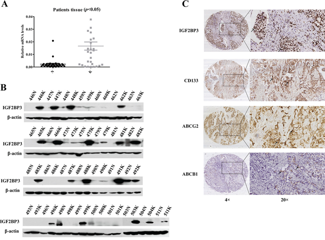 Figure 5: IGF2BP3 expression correlated with adverse prognosis in HCC patients. The expression of IGF2BP3 at mRNA A. and protein B. level in 30 pairs of patients samples. C. The IHC results of IGF2BP3, ABCG2 and CD133 expression in HCC samples. Representative images are shown. The arrows point to the representative positive staining cells in the images. Original magnification of pictures, 200×.