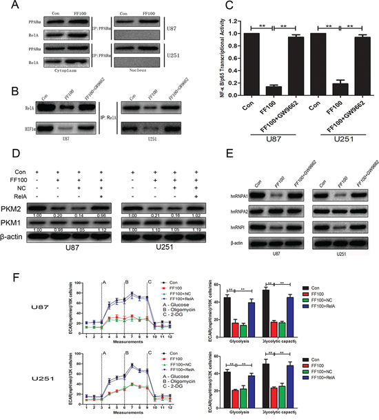 It has been reported that PPARα interacts with RelA and the interaction region contains RHD, which mediates DNA binding [15]. In glioblastoma cells, the interaction of PPARα and RelA only appeared in the cytoplasm. Treatment with FF (FF100) significantly promoted the interaction of PPARα and RelA in the cytoplasm (Figure 3A). FF-mediated activation of PPARα not only notably suppressed NF-κB/RelA transcriptional activity but also promoted the separation of NF-κB/RelA and HIF1α (Figure 3B and Figure 3C). Following this, to determine whether NF-κB/RelA is responsible for FF-mediated anti-glycolysis in glioblastoma cells, we performed glycolysis stress test assays. The results in Figure 3F demonstrated that NF-κB/RelA overexpression obviously reversed FF-induced inhibition of glycolysis. Interestingly, the PKM2 protein level was remarkably attenuated, whereas the expression of PKM1 did not change (Figure 3D). FF-induced suppression of hnRNPA1 and hnRNPΙ may contribute to this interesting result (Figure 3E).