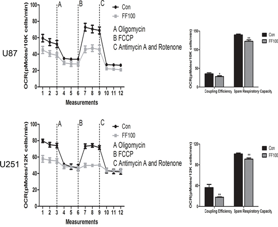 Figure 4: OCR was measured by the cell mito stress tests in glioma cell lines treated with FF (100 μM). *P < 0.05, **P < 0.01. Results are representative of at least three independent experiments.