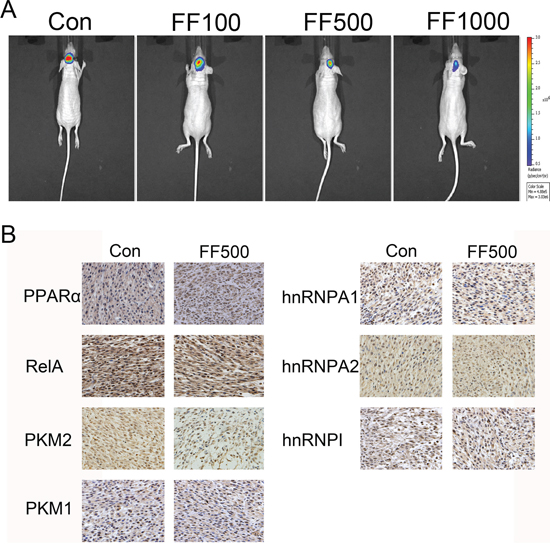 Considering the remarkable anti-glioblastoma effects of FF in vitro, we extended our investigation to test if FF could attenuate glioblastoma growth in vivo using nude mice. Bioluminescence imaging showed inhibition of the tumor growth in FF-treated group compared with the control group (Figure 6A). We also evaluated PPARα, RelA, PKM1/2 and hnRNPs protein expression by Immunohistochemical (IHC) staining in a nude mouse glioma xenograft model to study the correlation among them. The results in Figure 6B revealed that the nuclear expression level of PPARα was increased and that of RelA was decreased. PKM2, hnRNPA1 and hnRNPΙ expression was significantly decreased, whereas PKM1 and hnRNPA2 had no obvious change. These results in vivo and vitro provide demonstration of the role of FF in the regulation of the PPARα/ RelA/PKM2 pathway in glioma (Figure 7).