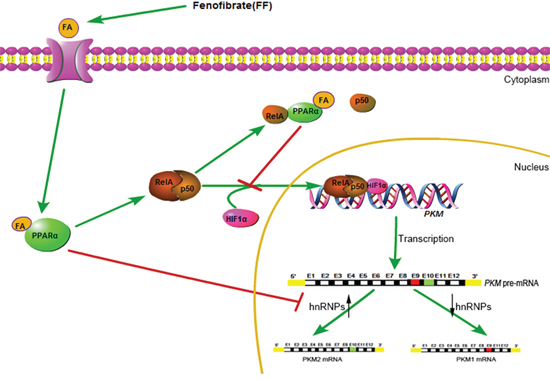 Fenofibrate (FF) is used to treat hyperlipidemia and hypercholesterolemia [22]. FF has antiproliferative, antimetastatic, and pro-apoptotic effects in tumors of neuroectodermal origin, including melanoma, medulloblastoma, and glioblastoma [23–25]. In our study, we confirmed that FF inhibits glioblastoma glycolysis in a dose-related manner depending on PPARα activation. The role of NF-κB activation during inflammatory response has been intensively studied [26]. PPARα represses inflammatory genes that can be ascribed to the PPARα antagonistic action against NF-κB/RelA [15]. Furthermore, NF-κB/RelA is implicated in many hallmarks of cancer, including proliferation, prevention of apoptosis, and promotion of angiogenesis and metastasis [27, 28]. NF-κB/RelA promotes aerobic glycolysis through transcriptional activation of Glut3 [29] and PKM2 [8]. In the present study, FF inhibited the transcriptional activity of NF-κB/RelA and dissociated RelA and HIF1α, which is required for the binding of NF-κB/RelA to the PKM promoter and PKM2 expression. In addition, NF-κB/RelA-dependent PKM transcription acts in coordination with splicing of pre-mRNA, which is mediated by FF-induced downregulation of hnRNPA1 and hnRNPΙ, leading to reduced expression of PKM2 but not PKM1. Thus, NF-κB/RelA-PKM2 is involved in FF-induced inhibition of glycolysis.