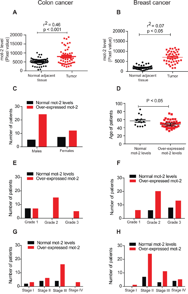 Figure 1: The heat shock protein mot-2 plays a critical role in tumorigenesis. Equal amounts of tumor tissue lysates from 48 patients with colon cancer (A) and 55 patients with breast cancer (B) along with matched adjacent normal tissue lysates were probed with anti-mot-2 and anti-actin antibodies followed by quantitation and normalization of signals. A–B. These two diagrams show densitometry-quantified signals of mot-2 expression in tumor tissue versus normal adjacent tissue. The expression of mot-2 in the tumor tissues of patients diagnosed with colon cancer (A) and breast cancer (B) was significantly higher as compared to normal tissues (Colon tumor: R2 = 0.46 and P < 0.001, Breast tumor: R2 = 0.07 and P < 0.05, correlation coefficient test for each pair of variables). C. Overexpression of mot-2 in colon cancer is gender-dependent. Higher numbers of male patients show overexpression of mot-2 as compared to female patients. D. Overexpression of mot-2 in breast cancer is age-dependent. The statistical analysis shows that a relatively higher number of young female patients showed over-expression of mot-2 levels. E–H. Profiling of grade- and stage-dependent of tumors with colon (E and G) and breast (F and H) cancer showed that patients with mot-2 overexpression have been diagnosed with a higher grade and stage of tumors, indicating poorer survival. These clinical results confirm mot-2 as a potential target for the treatment of cancers and a promising prognostic factor.