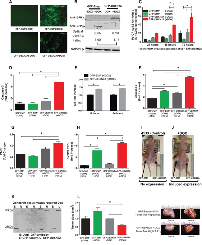 Figure 2: Induction of UBXN2A slows the growth of a colon cancer tumor ex vivo and in a mouse xenograft model by 50%. A. A Tet-on regulated inducible HCT-116 colon cancer cell line was established successfully. 48 hours incubation with Doxycycline (DOX, 10 mg/ml) induces an equal expression of GFP-empty (EMP) or GFP-UBXN2A in HCT-116 cells. Images were taken using an inverted fluorescent microscope. B. WB showing the expression of GFP-empty and GFP-UBXN2A proteins in HCT-116 cells when treated with DOX for 48 hours. An anti-GFP antibody was used to detect the levels of GFP alone or of GFP-UBXN2A fusion proteins, while GAPDH was used as a loading control. Optical density of bands were measured by Image Studio software C. Inducible cells (GFP-EMP or GFP-UBXN2A) were treated with DOX for the indicated times. Cells were then stained with PerCP-Cy5.5 Annexin V antibody, and a total of 10, 000 gated events were analyzed by flow cytometry. DOX-induced UBXN2A expression in 48 and 72 hours showed a significant increase in annexin binding in those cells. The data is shown as mean ± SEM of three independent experiments in trplicate (n = 3) where *p < 0.001 using Tukey's modified student's t-test. D. Inducible cells (GFP-EMP or GFP-UBXN2A) were treated with DOX for 48 hours, followed by staining with Alexa Fluor 546 anti-caspase-3 antibody. Cells were analyzed using flow cytometry and collected data was normalized with GFP-EMP (+DOX). The DOX-induced UBXN2A expression significantly increased caspase-3 levels (n = 3, *p < 0.05). E. Inducible cells (GFP-EMP or GFP-UBXN2A) were treated with DOX for the indicated times. Immunofluoresence of p21 was performed. Intensity of fluorochrome signals from a confocal microscope were analyzed by the Image J (NIH, Bethesda, MD) program and plotted. The data was normalized with GFP-EMP (+DOX). The expression of UBXN2A significantly increased levels of p21 (n = 100, *p < 0.001). F–G. HCT-116 cells expressing GFP-EMP and GFP-UBXN2A under DOX were treated with 5-FU (100 μM) for 48 hours. Cells were then stained with Alexa Fluor 546 anti-caspase-3 (F) or anti-cleaved PARP (G) antibodies, followed by flow cytometry analysis. The induced UBXN2A significantly enhanced 5-FU-induced increase in caspase-3 and cleaved PARP levels (n = 3, *p < 0.05). H. Inducible HCT-116 cells were incubated with DOX and 5-FU for 48 hours, stained with Sytox Red, and then the population of dead cells was analyzed using flow cytometry. UBXN2A significantly enhanced 5-FU-induced cell death (n = 3, *p < 0.05). I–J. 1 × 107 Tet-on inducible cells were injected subcutaneously into the lower flanks of nude mice. The animals with palpable tumors (< 5 mm3) for early-stage tumor response were divided into two groups after injection to be fed with a standard diet (controls) or a DOX-containing diet (625 mg/kg). Tumor volumes in mm3 were determined with digital calipers by the formula Volume = (width) 2 × length/2 every second day for 40 days. K. Expression of GFP-empty or GFP-UBXN2A proteins in dissected xenografts confirmed successful tumor responses to DOX after 40 days. L. Growth of tumors with and without DOX on day 40. Treatment with DOX significantly decreases tumor size and weight by more than 50%. The data is shown as mean ± SEM of 9 mice (n = 4 for control and n = 5 for DOX) where *p < 0.05 using Tukey's modified student's t-test.