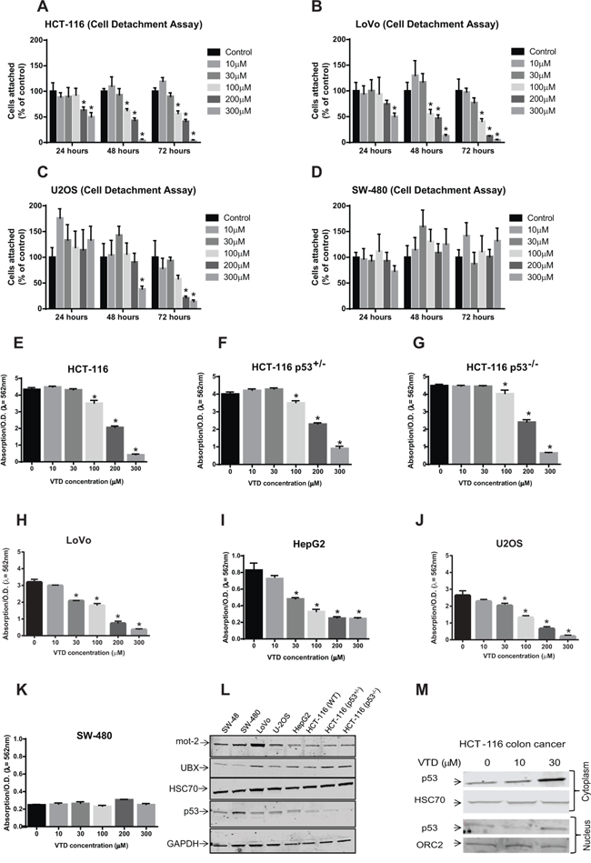 Figure 4: Induction of apoptosis and in vitro cytotoxicity by VTD in human cancer cell lines with different statuses of p53 and mot-2. A–D. Cells were treated with VTD for 24, 48, and 72 hours. After incubation, dead cells were washed off, and the remaining attached cells were calculated by counting in five random fields using the Axiovert 200 M inverted microscope and AxioVision software (cell detachment assay). The % of cells attached was calculated as % of control cells. VTD significantly decreases the % of cells attached in a dose-dependent manner in cancer cells with WT-p53 (A: HCT-116, B: LoVo and C: U2OS) but not with mutant p53 (D: SW480). The data in Panel D suggest Veratridine might promote cell proliferation. However, a strict statistical analysis rejects any significant changes in SW-480 cells. The data is shown as mean ± SEM of three independent experiments (n = 3, *p < 0.05). E–K. Cells were plated for 5 days, and the colonies of cells were treated with different concentration of VTD. The colonies of viable cells were stained with crystal violet dye and absorbance, as an index of measurement of colony forming units, was read at 562 nm (clonogenic survival assay). VTD induced a significant decrease in cell viability in a p53- and differentiation grade manner in HCT-116 poorly differentiated cells (E), HCT-116 p53+/− (F), HCT-116 p53−/− (G), LoVo well-differentiated cells (H), SW-480 (K), and two non-colon cancer cells: HepG2 (I) and U2OS (J) The data is shown as mean ± SEM of three independent experiments (n = 3, *p < 0.05). L. Determination of endogenous levels of mot-2, UBXN2A, HSC70, and p53 proteins in various cancer cell lines using WB. M. HCT-116 cells were treated with VTD (10 and 30 μM) and cytoplasmic and nuclear fractions were subjected to WB. HSC70 and Orc-2 antibodies were used as cytoplasmic and nuclear markers, respectively. VTD increases p53 in both cytoplasm and nucleus compartments in a dose-dependent manner.