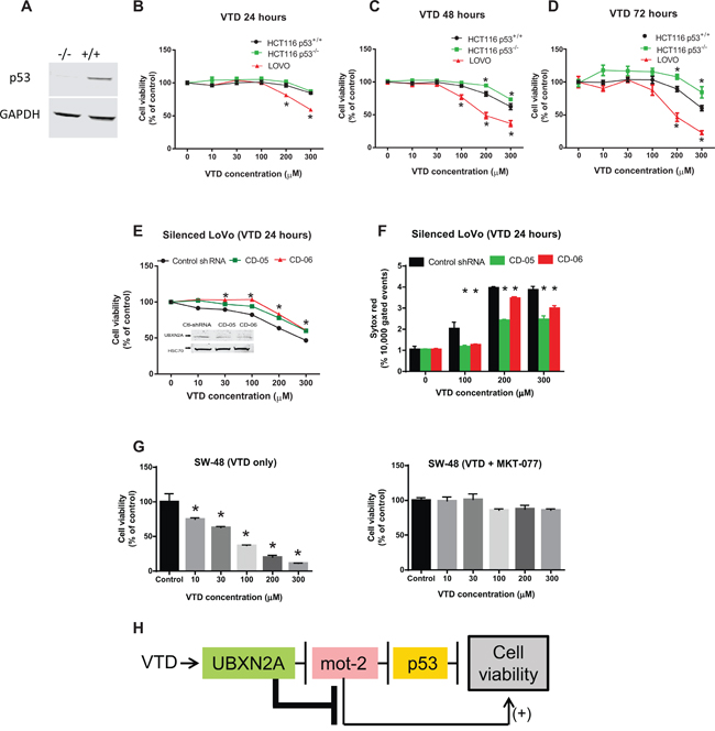 Figure 5: VTD functions via the UBXN2A-mot-2-p53 axis. A. WB confirmed the presence and the absence of p53 protein in HCT-116 p53(+/+) and HCT-116 p53(−/−) cancer cell lines, respectively. B–D. The effect of VTD on the viability of poorly-differentiated (HCT-116 p53(+/+) and HCT-116 p53 (−/−)) and well-differentiated (LoVo) colon cancer cell lines was determined using an MTT assay. VTD's cytotoxic effect on all three cell lines was dose dependent in (B) 24 hours, (C) 48 hours, and (D) 72 hours. As compared to the HCT-116 p53(+/+) cells, HCT-116 p53(−/−) cells showed more resistance to VTD's effects, whereas well-differentiated (LoVo) colon cancer cells showed the highest sensitivity to VTD. E. LoVo cells were stably silenced for UBXN2A using a UBXN2A-shRNA along with a scrambled shRNA. Viability of UBXN2A-silenced cells was found to be significantly higher as compared to control cells upon treatment with VTD. F. In another set of experiments, UBXN2A-silenced cells were treated with VTD (100, 200, and 300 μM) for 24 hours. Cells were then labelled with Sytox Red followed by flow cytometry analysis. Results showed silencing of UBXN2A significantly decreases cell death in response to VTD. G. SW48 well-differentiated colon cancer cells with WT-p53 were treated with MKT-077 (5 μg/ml), a mot-2 inhibitor, along with VTD for 72 hours. A clonogenic survival assay showed VTD signifcantly decreases the colony number of SW-48. However, preincubation with MKT-077 neutralizes the cytotoxic effect of VTD. The data is shown as mean ± SEM of three independent experiments (n = 3) in triplicate where *p < 0.05 using Bonferroni's modified student's t-test. H. This flowchart recapped the sequence of proteins which activate and function upon VTD exposure to decrease cell viability.