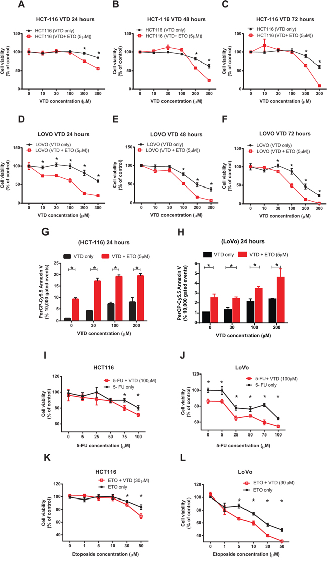 Figure 6: Synergistic inhibitory effects of VTD and etoposide or 5-FU chemotherapeutic drugs on the growth of human colon cancer cells. A–C. HCT-116 and D–F. LoVo cells were treated with VTD (10-300 μM) for 24, 48, and 72 hours. A suboptimal dose of Etoposide (ETO) (5 μM) was added to cells for the last 24 hours only. The viability of cells was determined as % of control (untreated cells) using an MTT assay. The chemotherapeutic drug ETO significantly enhanced the VTD-induced decrease in cell viability of both poorly differentiated (HCT-116) and well-differentiated (LoVo) colon cancer cell lines in a time-dependent manner. G–H. HCT-116 (G) and LoVo (H) cells were treated with VTD (10–200 μM) and a suboptimal dose of ETO (5 μM) for 24 hours. Cells were then stained with Annexin V apoptotic marker. ETO significantly sensitizes both poorly and well-differentiated colon cancer cells to VTD even at 30 μM. I–L. HCT-116 and LoVo cells were treated with different doses of 5-FU (5–100 μM, I-J) and ETO (1–50 μM, K-L) along with VTD (30 μM and 100 μM respectively) for 24 hours. MTT assays showed the treatment with 5-FU and ETO with VTD decreased cell viability at much lower drug doses particularly in LoVo cells. Results were analyzed using CalcuSyn software to calculate the combination index (CI) to confirm and quantify the synergism observed with combination therapies (S6 and S7 and Supplementary Tables 4 and 5). The data is shown as mean ± SEM of three different experiments (n = 3) where *p < 0.001 using Bonferroni's modified student's t-test.