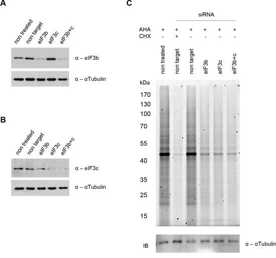 Figure 1: siRNA mediated knockdown of eIF3b and/or eIF3c blocks nascent protein synthesis in IMR-90 cells. IMR-90 cells were transfected with specific siRNAs or left untreated as indicated. A and B. Knockdown efficiency was confirmed by immunoblotting using antibodies specific for (A) eIF3b and (B) eIF3c. αTubulin serves as a loading control. C. L-azidohomoalanine (AHA) incorporation was measured after 3.5 hours. Cycloheximide (CHX) was used as a control for total protein synthesis inhibition at a final concentration of 50 μM. Nascent protein synthesis was evaluated by fluorescent scanning of AHA bound Tetramethylrhodamine (TAMRA) at Ex550/Em570. Loading was verified by immunoblotting using αTubulin antibody as a control.
