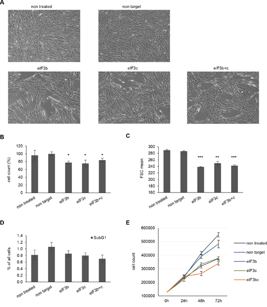 Figure 2: Depletion of eIF3b and/or eIF3c decreases proliferation and cell size of IMR-90 cells. A. Representative pictures of siRNA treated IMR-90 cells 72 hours post transfection are shown (magnification 4x). B. Cell numbers were measured using Casy cell counter at 72 h after transfection. Total numbers were normalized to non-target siRNA-transfected cells. C. Cell size was assessed by flow cytometry using the parameter forward scatter (FSC). D. Percentage of apoptotic cells (subG1-fraction) was determined by flow cytometry of propidium iodide (PI)-labeled cells at 72 h post transfection. One representative experiment out of two is shown. E. Proliferation curves of control and eIF3b-, eIF3c- and eIF3b and c-depleted IMR-90 cells. Cells were transfected and counted at 0, 24, 48 and 72 hours post transfection. (B and C) Figures show means of two independent experiments performed in triplicates. Error bars represent means ± SD.
