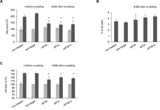 Figure 3: Depletion of eIF3b and/or eIF3c in HEK293 cells causes reduced proliferation and smaller cell size after re-plating of cells. A. Cells numbers were measured before (72 h after transfection) and 20 h after re-plating. Cell numbers were normalized to non-target siRNA-transfected cells before re-plating. B. Percentage of apoptotic cells was evaluated by PI-staining. One representative experiment out of two independent experiments performed in triplicates is shown. C. Cell size was determined with Casy cell counter by analyzing cell volume (fl). Cell volumes were normalized to non-target siRNA-transfected cells before re-plating. (A, C) Figures show means of two independent experiments performed in triplicates. Error bars represent means ± SD.