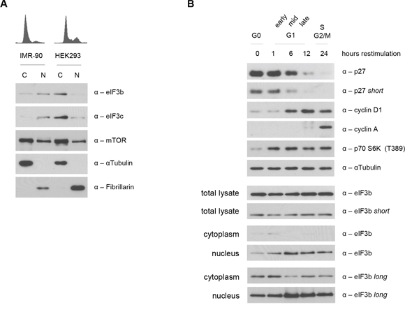 Figure 5: Subcellular and cell cycle dependent localization of eIF3b and eIF3c. A. Cellular localization of endogenous eIF3b and eIF3c was verified in cytoplasmic (C) and nuclear lysates (N) of IMR-90 and HEK293 cells. Purity of protein fractions was confirmed by the use of antibodies specific for cytoplasmic (αTubulin) and nuclear (Fibrillarin) proteins. B. IMR-90 cells were cell cycle synchronized in G0/G1 via serum deprivation and then re-stimulated. Cell cycle regulated proteins like p27, cyclinD1 and cyclinA were used as a control to show the stages of cell cycle progression upon serum re-stimulation (upper panel). Total and subcellular fractions of the same pool of cells were analyzed for eIF3b protein expression at 0, 1, 6, 12 and 24 hours post serum re-stimulation (lower panel).