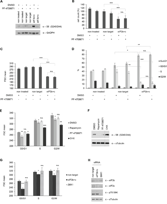 eIF3 has been suggested to exert a dual role of action in living cells: First, it may represent a scaffold for the mTOR-S6K1 signaling axis, where it interacts with the inactive S6K1 in unstimulated conditions, while relieving it as phosphorylated S6K1 upon mTOR-mediated growth-promoting conditions. Second, eIF3 may solely act as a part of the translational preinitiation complex (PIC) and thus represent an essential component of the ribosomal protein synthesis machinery and cell size control. However, which of these two functions for eIF3 is presumably dominant over the other, remains currently unclear. To identify whether the observed hyperactive S6K1-S6 axis is the cause or consequence of eIF3-mediated reduction of cell size, we next evaluated the biological effects of a concurrent eIF3 and S6K1 inactivation. Therefore, we treated control and eIF3b/eIF3c-depleted IMR-90 cells with PF-4708671, a specific S6K1-inhibitor [35] for 24 hours. PF-4708671 treatment successfully inhibited the phosphorylation of ribosomal protein S6 in control and in eIF3b/c depleted cells (Figure 6A). To measure the effect of PF-4708671 on cell size, proliferation or apoptosis, we re-plated the non-treated, non-targeted and eIF3b/c-targeted IMR-90 for further 16 h in presence or absence of PF-4708671. As shown in Figure 6B, double knockdown of eIF3b and eIF3c significantly reduced the number of viable cells compared to non-targeted IMR-90 cells, yet no specific PF-4708671 effect was detectable. Similarly, PF-4708671 did not alter the difference in cell size caused by eIF3b/c-depletion (Figure 6C). When we analyzed the proportions of IMR-90 cells corresponding to distinct cell cycle and apoptotic stages, the eIF3b/c-depleted cells showed a profound increase in G1 and a concomitant decrease in S-phase, irrespective of the presence or absence of PF-4708671 (Figure 6D). To further substantiate these findings, we compared the cell size effects of PF-4708671 with rapamycin- and cycloheximide-treatments in each phase of the cell cycle. Treatment with rapamycin and cycloheximide led to a strong reduction of size in G0/G1-, S- and G2/M-phases, while PF-4708671 had no effect on size in any of the cell cycle phases (Figure 6E). This was not due to altered inhibitor activity since rapamycin and PF-4708671 effectively inhibited S6K1-activity (Figure 6F). Interestingly, S6K1-activity was increased in cycloheximide treated cells (Figure 6F), indicating that S6K1-activity per se does not correlate with size. To determine a possible direct effect of S6K1 on cell size, we next depleted S6K1 from IMR-90 cells and compared the size of eIF3b/c-depleted with S6K1-depleted IMR-90 cells. As shown in Figure 6G, eIF3b/c-depleted IMR-90 cells showed significant reduction of cell size in G0/G1-, S- and G2/M-phases, while S6K1-depleted cells did not. The corresponding knockdown efficiencies have been confirmed in Figure 6H. These findings suggested that specific S6K1-inhibition cannot modulate cell size of wild-type nor eIF3-depleted cells and that eIF3 regulates cell size independently of S6K1-activity.