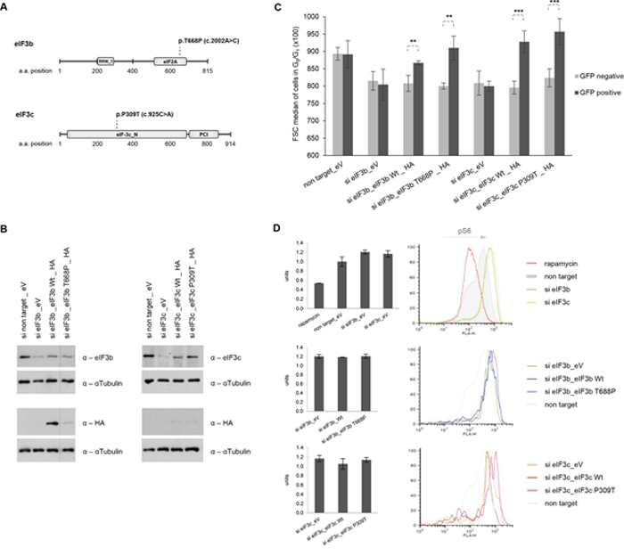 Figure 7: Re-expression of wild-type and mutant forms of eIF3b and eIF3c restores knockdown-induced cell size defects, independently of S6K1-activity. A. Schematic representation of eIF3b and eIF3c protein secondary structure including annotated Pfam-A protein domains. The substitution missense mutation of eIF3b (p.T668P) is located in the eIF2A region and of eIF3c (p.P309T) in the N terminal region. RRM_1, RNA recognition motif; eIF2A, eukaryotic translation initiation factor eIF2A; eIF-3c_N, eukaryotic initiation factor 3 subunit 8 N terminus; PCI, PCI domain (Cosmic database). B. IMR-90 cells depleted for eIF3b and eIF3c were transfected with empty vector (eV), wild-type (Wt) eIF3b, Wt eIF3c or the corresponding mutants. To avoid interference in detection of eIF3b, eIF3c and HA-tagged proteins due to similar protein size, the same lysates were detected on separate membranes. C. A control vector carrying GFP-spectrin was co-transfected in all settings used. Cell size was measured in GFP-negative (untransfected fraction) and GFP-positive cells (transfected fraction). Representative bar diagrams out of two independent experiments are shown. Error bars correspond to means ± SD. D. Phosphorylation levels of S6 (S240/244) protein were determined by phospho-specific flow cytometry in GFP-positive cells using the same co-transfection setting as in (C) Representative bar diagrams and histogram overlays out of two independent experiments are shown.