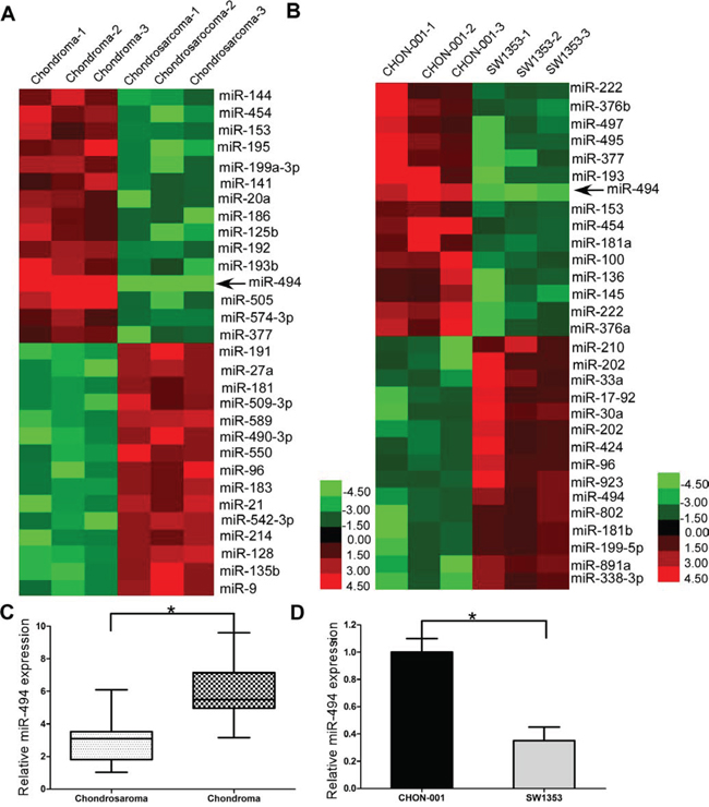 Figure 1: miR-494 is dwon-regulated in chondrosarcoma tissues and human chondrosarcoma cell line SW1353. A. miRNA expression between 3 chondrosarcoma tissues and 3 chondroma tissues; B. miRNA expression between chondrosarcoma cells and chondrocyte cells; C. miR-494 was downregulated in human chondrosarcoma tissues; D. miR-494 was downregulated in human chondrosarcoma cell line SW1353. Three independent experiments were performed in duplicate. Data were present as mean ± SD. Two-tailed Student’s t test was used to analyze the significant differences. *P < 0.05.