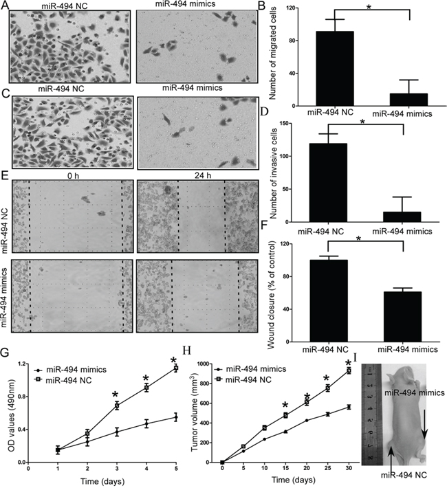 Figure 2: Effects of miR-494 on cell migration and invasion of chondrosarcoma cells. A and B. SW1353 cells transfected with miR-494 mimics significantly decreased the capacity of migration; C and D. SW1353 cells transfected with miR-494 mimics significantly decreased the capacity of invasion; E and F. Wound healing assays in the miR-494 mimics transfectants and normal control; G. MTT assays of miR-494 mimics and negative control-transfected cells; H and I. Analysis of tumor growth curves in the SW1353-miR-494 group and SW1353-NC group. Three independent experiments were performed in duplicate. Data were present as mean ± SD. Two-tailed Student’s t test was used to analyze the significant differences. *P < 0.05.