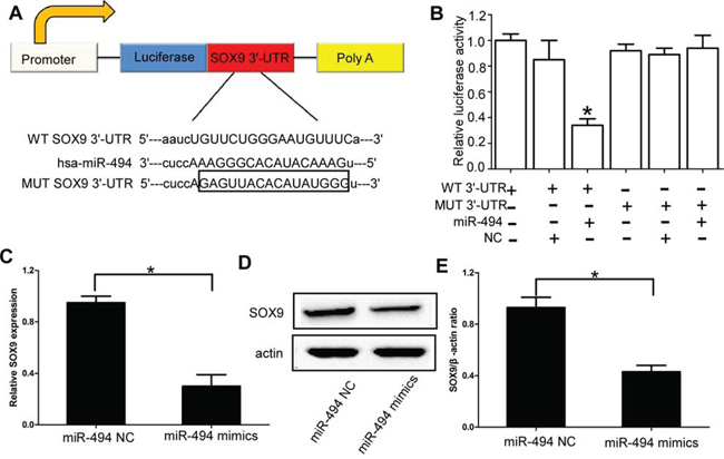 miR-494, microRNA-494; SOX9, SRY-related high mobility group-Box gene 9; WT, wild type; MUT, mutant; 3′-UTR, 3′-untranslated region; qRT-PCR, quantitative real-time polymerase chain reaction; NC, negative control-transfected cells.