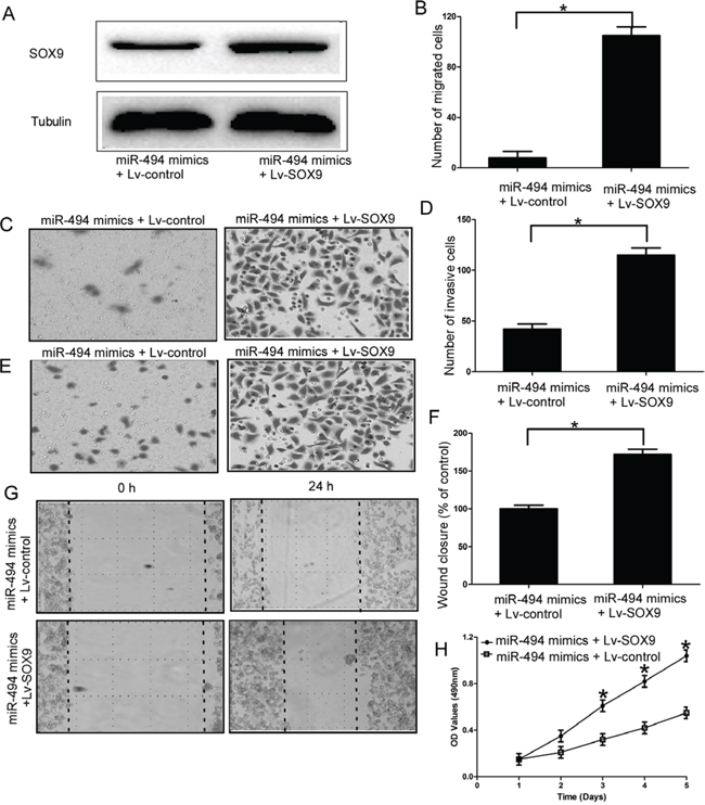 To further confirm SOX9 is a functional mediator of miR-494, SOX9 without the 3′-UTR was cloned into a lentivirus vector, and then packaged in 293 T cells by co-transfection with the third generation lentiviral packaging system including pMDGVSVG envelope, pMDLg/pRRE and pRSV-Rev packaging vectors. Then, lv-SOX9 and miR-494 mimics were transfected into chondrosarcoma cells. The upregulation efficiency of lv-SOX9 was determined by qRT-PCR at 48 h after transfection (Supplementary Figure 1B). Our results indicated the protein level of SOX9 was recovered after treatment with SOX9 (miR-494 mimics + lv-SOX9 group) compare to cells transfected with miR-494 (P < 0.05; Figure 5A). Furthermore, migration assays (P < 0.05; Figure 5B-5C, Supplementary Figure 5A), invasion assays (P < 0.05; Figure 5D-5E, Supplementary Figure 5B), wound healing assays (P < 0.05; Figure 5F-5G), and MTT assays (P < 0.05; Figure 5H, Supplementary Figure 5C) showed that the exogenous expression of SOX9 rescued the phenotype induced by overexpression of miR-494 in chondrosarcoma cells.