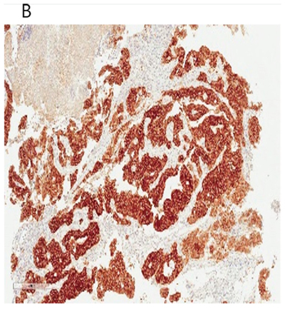 Figure 3B: ALK IHC showing strong diffuse staining of ALK antibody (3+) of the EML4-ALK (E21; A20) adenocarcinoma of the colon patient after palliative resection.