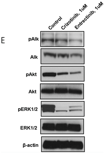 Tumor cell line derived from this patient was inhibited by 1 μM crizotinib (p < 0.0001, one-way ANOVA test) or to a greater extent with 1 μM entrectinib (p < 0.0001 vs. no ALK inhibitor; p < 0.0001 vs. crizotinib one-way ANOVA test) (Figure 3D). Both crizotinib and entrectinib inhibited the phosphorylation of ALK and its downstream signal molecules, including ERK1/2 and AKT from this EML4-ALK rearranged colon patient tumor derived cell line (Figure 3E).