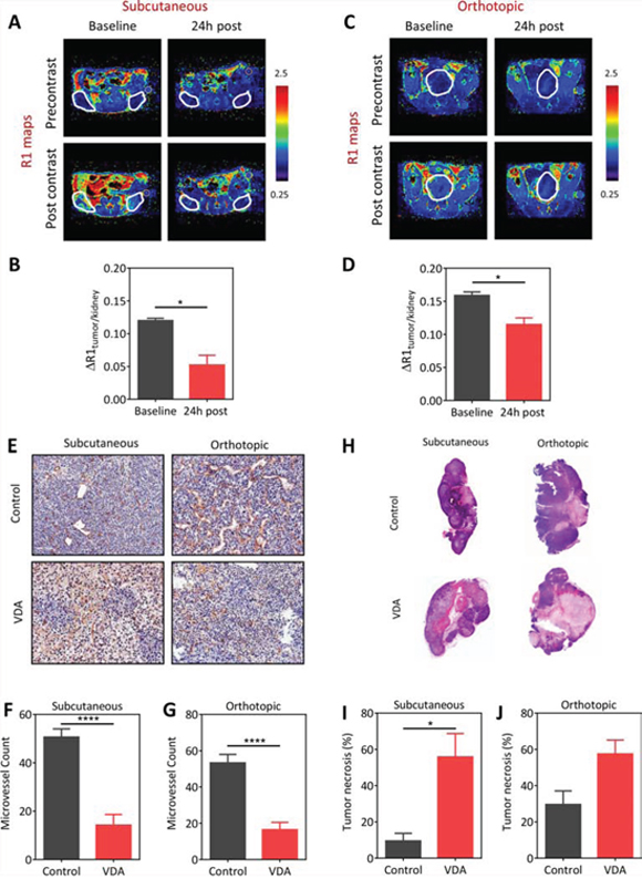 Figure 1: Vascular disruptive activity of EPC2407 against subcutaneous and orthotopic Myc-CaP prostate tumors evaluated by magnetic resonance imaging and immunohistochemistry. A–D: Pseudo-colorized R1 (1/T1)-relaxation maps of mice bearing subcutaneous (A) and orthotopic (C) Myc-CaP tumors (outlined in white) at baseline and 24 hours post treatment with the VDA EPC2407. R1 maps were generated before (precontrast) and after (post contrast) administration of the MR contrast-enhancing agent, albumin-Gd-DTPA. Bar graphs show normalized R1 values of the tumor (ΔR1tumor/kidney) of subcutaneous (B; n = 4) and orthotopic (D; n = 3) tumors at the same time points. The kidney was chosen as a surrogate for contrast agent concentration in blood and to account for potential variations in contrast injection between the animals at different time points. A significant (p < 0.05) reduction in contrast agent uptake was seen in both models following VDA treatment. E. CD31-stained tumor sections from control and VDA-treated subcutaneous and orthotopic prostate tumors (n = 3–4/group) are shown. Corresponding microvessel counts (MVC) are shown in F. and G. A significant reduction in microvessel count (p < 0.001) was seen in VDA-treated tumors compared to control tumors in both models. H. Corresponding hematoxylin and eosin stained sections of control and VDA treated tumors in both models are shown. VDA-treated tumors showed increased necrosis compared to control tumors in both models. I. Subcutaneous Myc-CaP tumors showed a significant increase (p < 0.05) in tumor necrosis following VDA treatment compared to control tumors. J. Differences in tumor necrosis between control and VDA-treated tumors in orthotopic tumors was not statistically significant (p > 0.05). *denotes p < 0.05 ****p < 0.001.