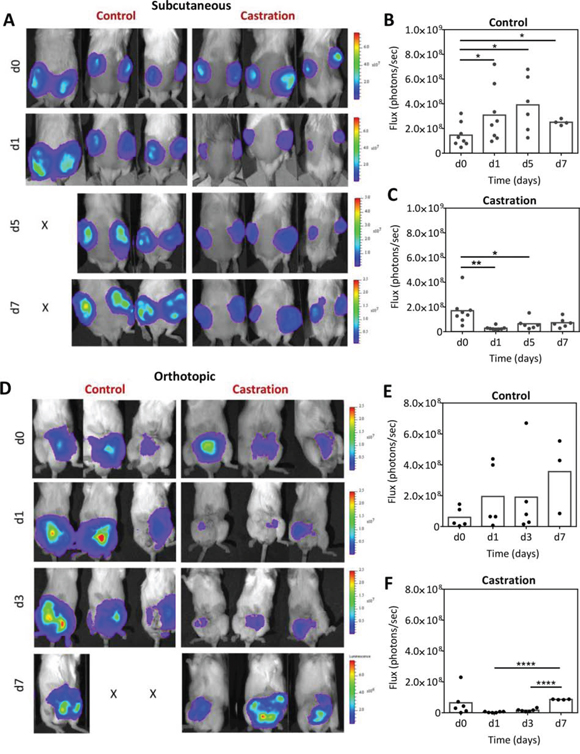 Figure 2: Bioluminescence imaging of Myc-CaP/ARE-luc tumor response to castration. A. Longitudinal BLI of mice bearing subcutaneous Myc-CaP/ARE-luc tumors before and after castration. Corresponding photon flux values of tumors in intact controls B. and castrated C. animals (n = 8 per group) are also shown. BLI revealed a significant reduction in AR activity following castration (24 h) which was followed by a recovery over a 5–7 day period post castration. D–F. Longitudinal BLI of mice bearing orthotopic Myc-CaP/ARE-luc tumors in the control (n = 5) and castration (n = 6) arms at baseline (d0; before castration) and on days 1, 3 and 7 post castration. AR signal levels returned to baseline levels in orthotopic tumors on d7 post castration. *denotes p < 0.05, **denotes p < 0.01, ****denotes p < 0.001.