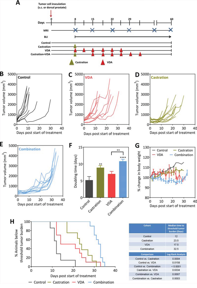 Figure 4: Efficacy of androgen deprivation in combination with vascular targeting against subcutaneous Myc-CaP tumors. A. Schematic of experimental design. Tumor-bearing mice were randomized into control, castration, VDA, and castration + VDA groups. Caliper measurements were obtained in mice bearing subcutaneous tumors while bioluminescence imaging along with MRI was performed to monitor growth of orthotopic tumors. B–E. Growth curves of s.c. Myc-CaP tumors in control, castration alone, VDA alone and combination arms. Tumor volumes were calculated from caliper measurements as described in Materials and Methods. Tumor doubling times F. and change in body weight G. of animals in all 4 experimental groups are shown. H. Kaplan-Meier survival curves of animals bearing subcutaneous Myc-CaP tumors in control and treatment groups. Median survival (days) based on percentage of animals below threshold tumor burden (based on ethical guidelines) and log-rank test p-values for each cohort compared to untreated control and between groups are shown. **p < 0.01 ****p < 0.001.
