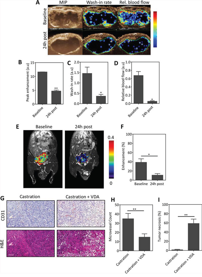 Figure 5: VDA treatment inhibits vascular recovery following castration. A. CE-US of vascular response of orthotopic Myc-CaP tumors (n = 3) to combination treatment. From left to right, images represent a maximum intensity projection (MIP), and parametric maps of wash-in rate and relative blood flow of an orthotopic Myc-CaP tumor at baseline (d7 post castration) and 24 h post VDA treatment (d8). Bar graphs showing quantitative estimates of perfusion values in arbitrary units (A.U.): peak enhancement B. wash-in rate C. and relative blood flow D. derived from the contrast signal intensity-time curves. A significant reduction in multiple parameters of vascular function was seen following combination treatment. E. and F. 3D MR angiography of orthotopic Myc-CaP response to combination treatment. (E) Pseudo colorized enhancement maps of signal intensity in a mouse bearing orthotopic Myc-CaP tumors at baseline (d7 post castration) and 24 h post VDA treatment overlaid on raw proton images. Consistent with the CE-US data, a significant reduction in enhancement was seen 24 h post VDA treatment indicative of a reduction in tumor blood flow (contrast agent delivery). G. Photomicrographs of CD31 and H&E sections of orthotopic Myc-CaP tumors (n = 3–4 per group) excised following castration and combination treatment (castration + VDA). Combination treatment resulted in a significant reduction in microvessel density H. which was associated with increased tumor necrosis I. compared to castration alone. *denotes p < 0.05, **denotes p < 0.01.