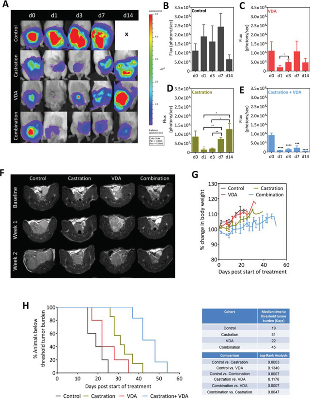 Figure 6: BLI and MRI based monitoring of therapeutic efficacy of EPC2407 in combination with castration against orthotopic Myc-CaP tumors. A. Bioluminescence images of mice bearing orthotopic luciferase-transfected Myc-CaP tumors and treated with castration alone, VDA alone or combination. B–E. Photon flux values over time for control (n = 7), castration alone (n = 6), VDA alone (n = 8) and combination arms (n = 10). Combination treatment resulted in sustained inhibition of tumor growth as evidenced from the low flux levels. F. Axial T2-weighted MR images of mice bearing orthotopic Myc-CaP tumors from all 4 experimental arms. Compared to either monotherapy, combination treatment resulted in sustained inhibition of tumor growth and delayed the onset of castration recurrent disease. G. No significant difference in body weight was observed between the 4 groups. H. Kaplan-Meier survival curves of animals bearing orthotopic Myc-CaP tumors in control and treatment groups. Median survival (days) of animals calculated based on time to reach threshold tumor burden for euthanasia and log-rank test p-values for each cohort compared to untreated control and between groups are shown. Combination treatment conferred a statistically significant survival benefit in this model with an improved median survival compared to castration alone and VDA alone. *denotes p < 0.05, **denotes p < 0.01, *** denotes p < 0.005, ****denotes p < 0.001.