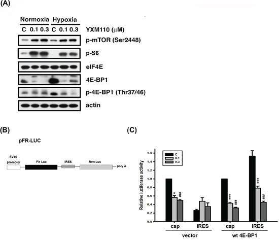 Figure 4: YXM110 suppresses cap-independent translation through 4E-BP1 deletion. A. HCT116 cells were treated with vehicle (0.1% DMSO) or YXM110 (0.1 or 0.3 μM) under normoxia or hypoxia conditions for 24 h. The cells were then harvested for detection of p-mTOR (Ser2448), eIF4E, 4E-BP1, p-4E-BP1 (Thr37/46), p-S6 (Ser240/244) and actin by western blot analysis. B. Bicistronic luciferase vector (pFR-Luc) contains a cap-dependent firefly (Fir) and cap-independent Renilla (Ren) luciferase. C. HCT116 cells were cotransfected bicistronic vector and wt 4E-BP1 for testing the effect of YXM110 on cap-dependent and cap-independent translation by using a dual Luciferase reporter system. *P < 0.05; ***P < 0.001; ###P < 0.001.
