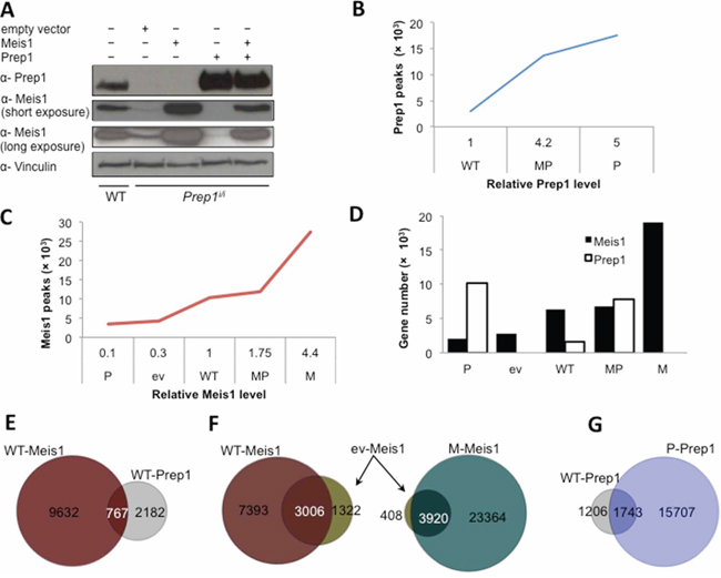 Figure 1: DNA binding profiles of Meis1 and Prep1 in MEFs. A. Western blot determining the relative levels of Meis1 and Prep1 in five different cell-types. Vinculin was used as loading control. B. Concentration-dependent binding of Prep1. Number of significant Prep1 peaks in WT, MP and P cells is shown relative to its protein levels (p < 10−6). C. Concentration-dependent binding of Meis1. Number of significant Meis1 peaks in P, ev, WT, MP and M cells is shown relative to its protein levels (p < 10−6). D. Graph shows the number of Meis1 and Prep1 target genes in the five cell-types. Ev and M cells express no Prep1 (refer to panel A). E. Venn diagram showing the overlap between Meis1 and Prep1 peaks in WT cells. F. Venn diagrams showing overlap of Meis1 peaks in ev and WT (left) or ev and M (right) cells. G. Venn diagram showing overlap of Prep1 peaks in WT and P cells.