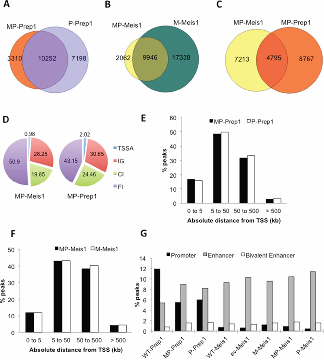 Figure 2: Overexpression modifies the enhancer preference of Prep1, not of Meis1. Venn diagrams showing the overlap of A. Prep1 peaks in MP and P cells, B. of Meis1 peaks in MP and M cells and C. of Meis1 and Prep1 peaks in MP cells. D. Pie chart showing that overexpressed Prep1 has twice as many TSS-associated peaks than Meis1 in MP cells. E. Overexpression of Prep1 in MP and P cells does not change the TSS-distance distribution of peaks. F. Overexpression of Meis1 in MP and M cells does not change the TSS-distance distribution of peaks. G. Prep1 overexpression, but not Meis1 overexpression changes the percent occupancy of regions containing promoter and enhancer marks in the various cell-types.