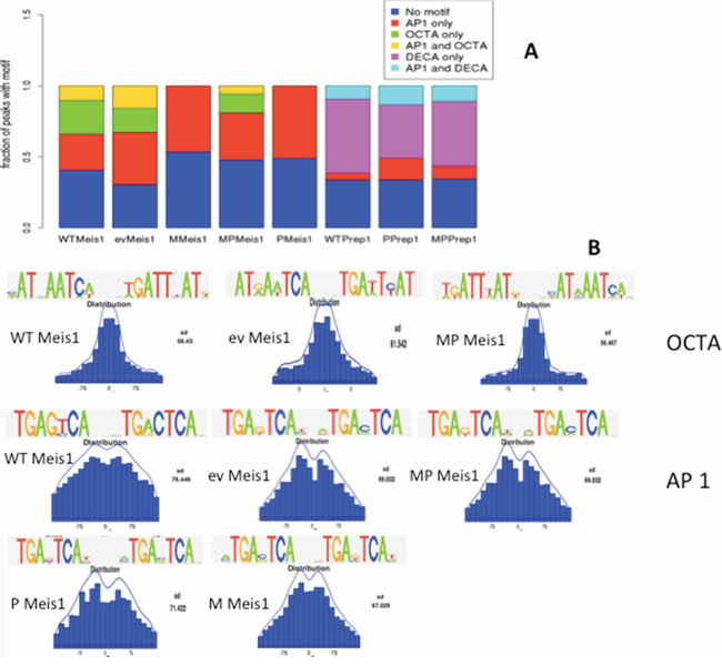 Figure 3: Meis1 and Prep1 binding sites in MEFs are enriched in AP-1 consensus DNA sequences. A. rGADEM OCTA and AP-1 motifs frequency in Meis1 and Prep1 ChIP-seq in the five cell lines. B. Position of the OCTA and AP-1 motifs in the 300 bp-large peaks.