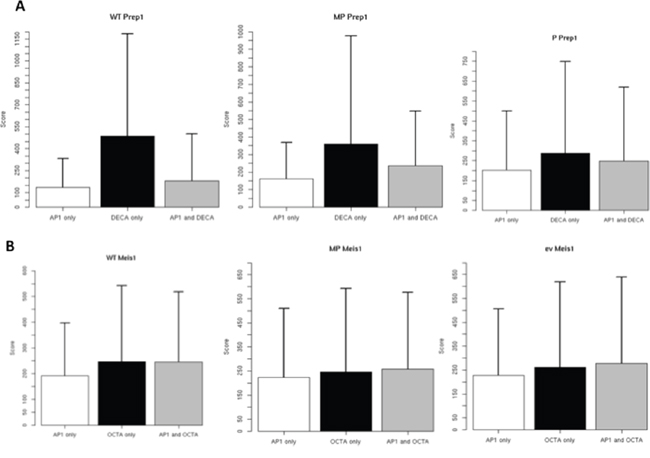 We next exploited the peak scores to compare the two consensus. A higher score does not directly indicate but must be related to higher affinity or binding to a higher fraction of the cells. In WT, P and MP cells, Prep1 peak score for DECA was on the average much higher than for AP-1 or DECA plus AP-1 consensus sites (Figure 4). No differences were instead observed for Meis1. The higher score of DECA for Prep1 may agree with Prep1 competing with Meis1 to the binding to AP-1 sites in MP cells.