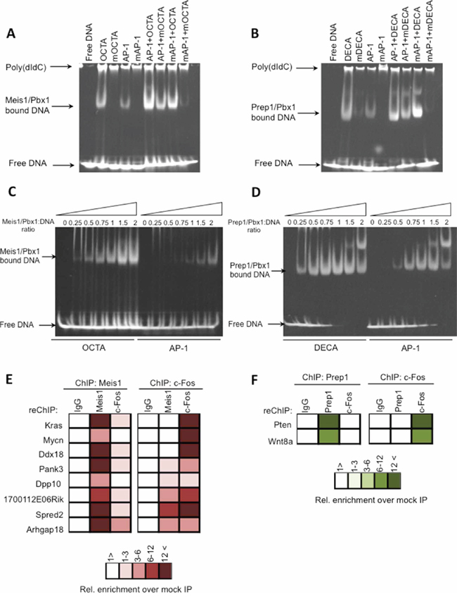 In vitro EMSA with a highly purified recombinant Meis1/Pbx1 heterodimer (see Methods) was used to show DNA binding to oligonucleotides containing OCTA, AP-1 or OCTA+AP-1 sites; likewise, the recombinant Prep1/Pbx1 heterodimer was tested with DECA, AP-1 or DECA+AP-1. The DNA sequences employed were chosen among the actual ChIP-seq peaks (see Methods in the Supplementary section), but a single nucleotide substitution abolished binding (Figure 5).